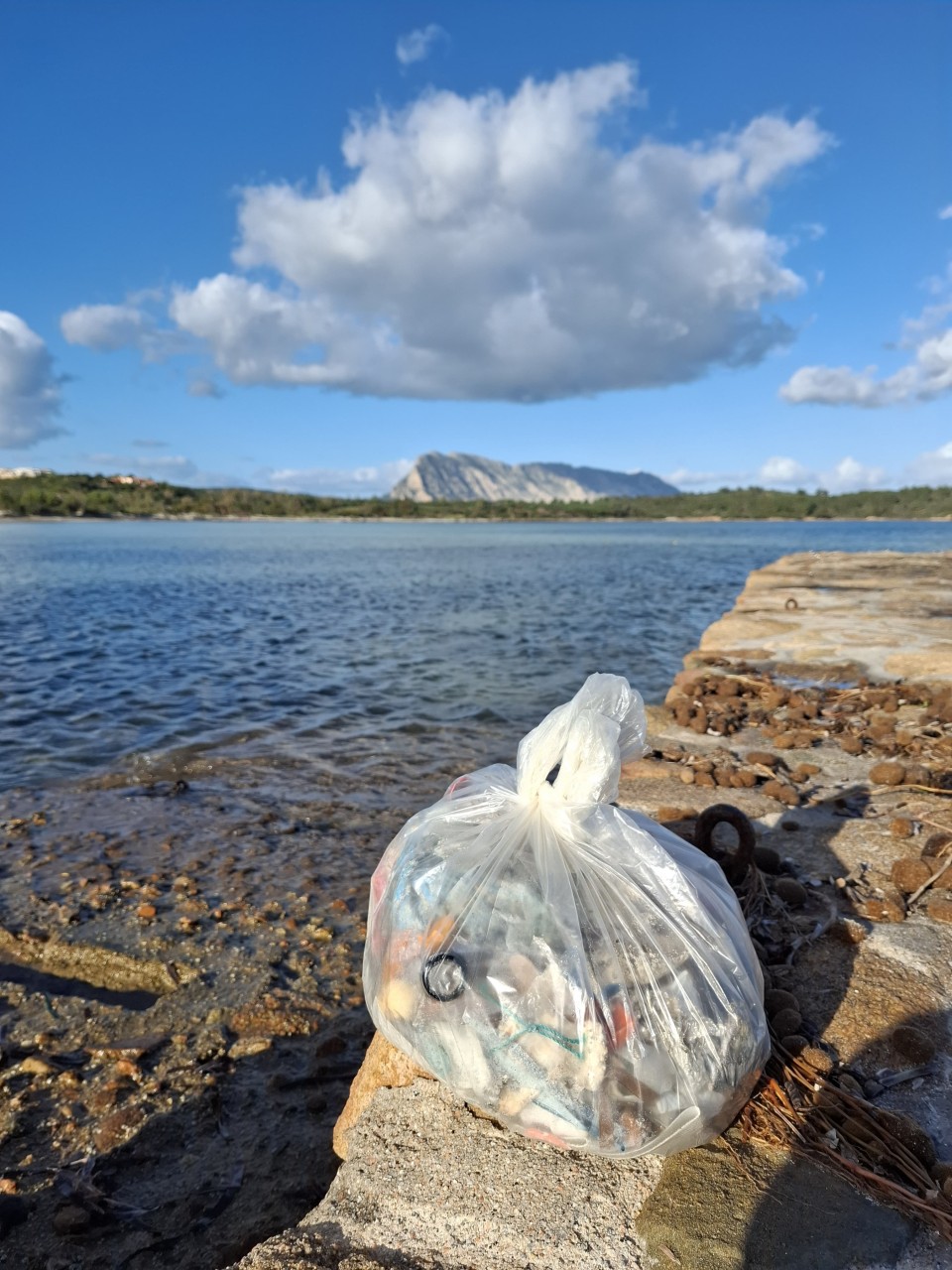 Giornata a due spiagge, il primo sacchetto arriva da Lu impostu, il secondo da Cala Brandinchi. Dopo le mareggiate di fine Gennaio, questo è il risultato.